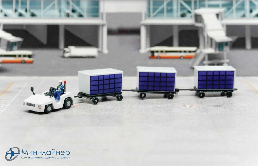Тягач и набор контейнеров на тележках. Дополнение к макету аэропорта или модели самолета в масштабе 1:200.
